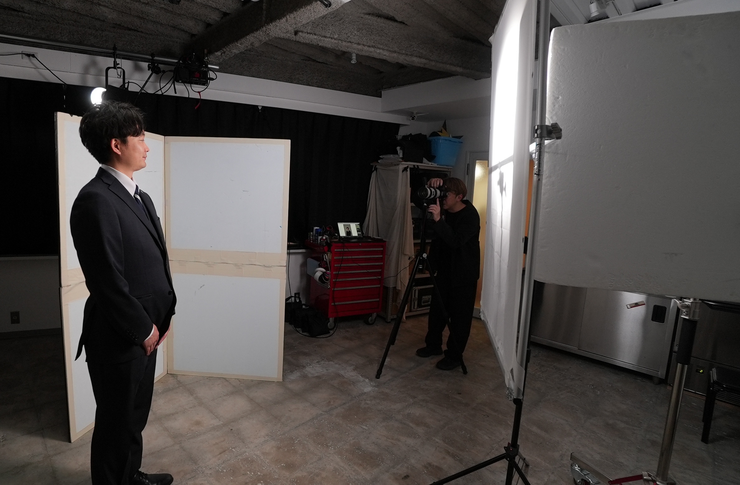 商品撮影から人物撮影まで幅広く対応できる、ゆとりあるスペースです。セット組みや複数カメラでの撮影も快適に行えます。